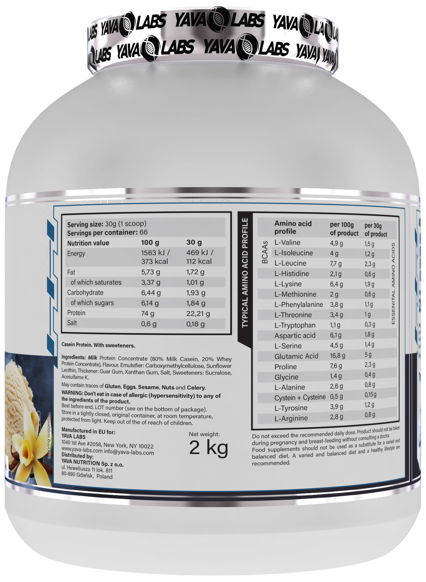 La proteína de caseína de Yava Labs. Esta fórmula especialmente elaborada está diseñada para ofrecer una fuente de proteína de liberación lenta, perfecta para mantener el crecimiento y la recuperación muscular durante el día y la noche.