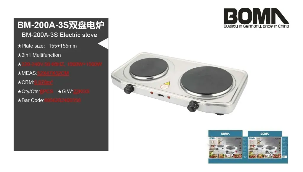 La Cocina Eléctrica BOMA BM-200A-3S está diseñada para quienes buscan practicidad y seguridad en su cocina. Sus dos placas calefactoras de hierro fundido ofrecen calentamiento rápido y uniforme, ideal para preparar todo tipo de comidas. Cada hornilla incluye un control de temperatura independiente, con luces indicadoras y base estable que evita accidentes. Fabricada con cuerpo metálico esmaltado, es resistente y de fácil limpieza. Perfecta como cocina auxiliar o principal en hogares, oficinas o espacios reducidos.