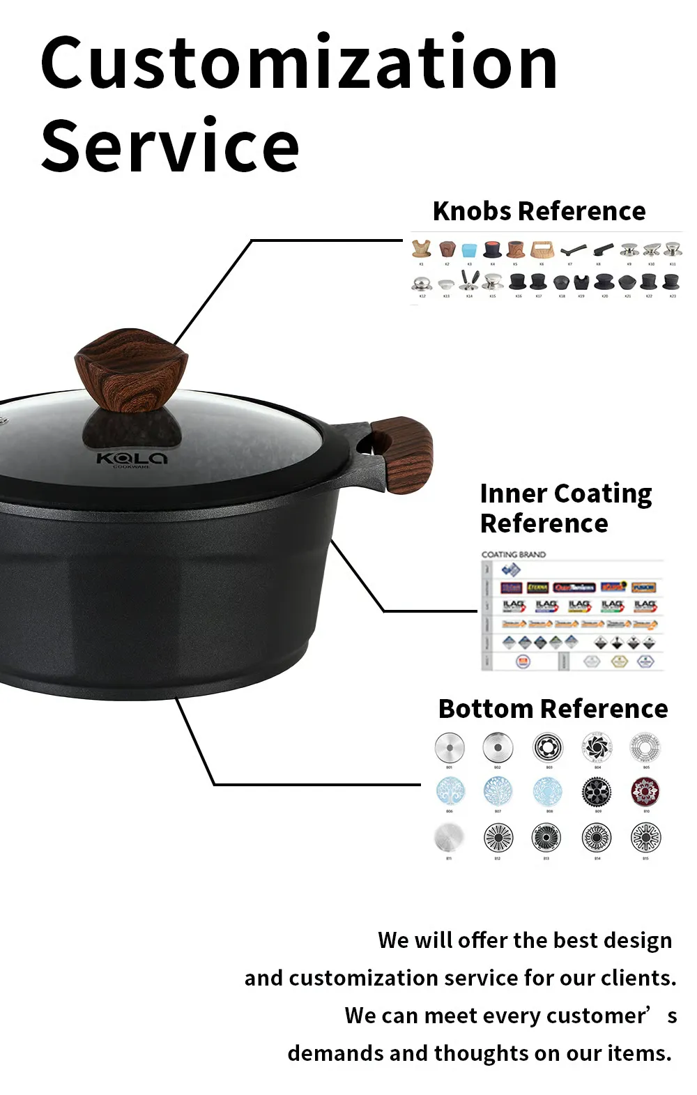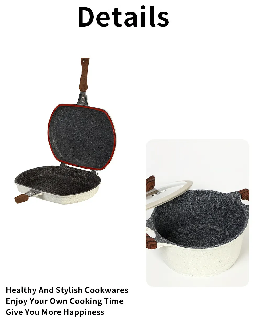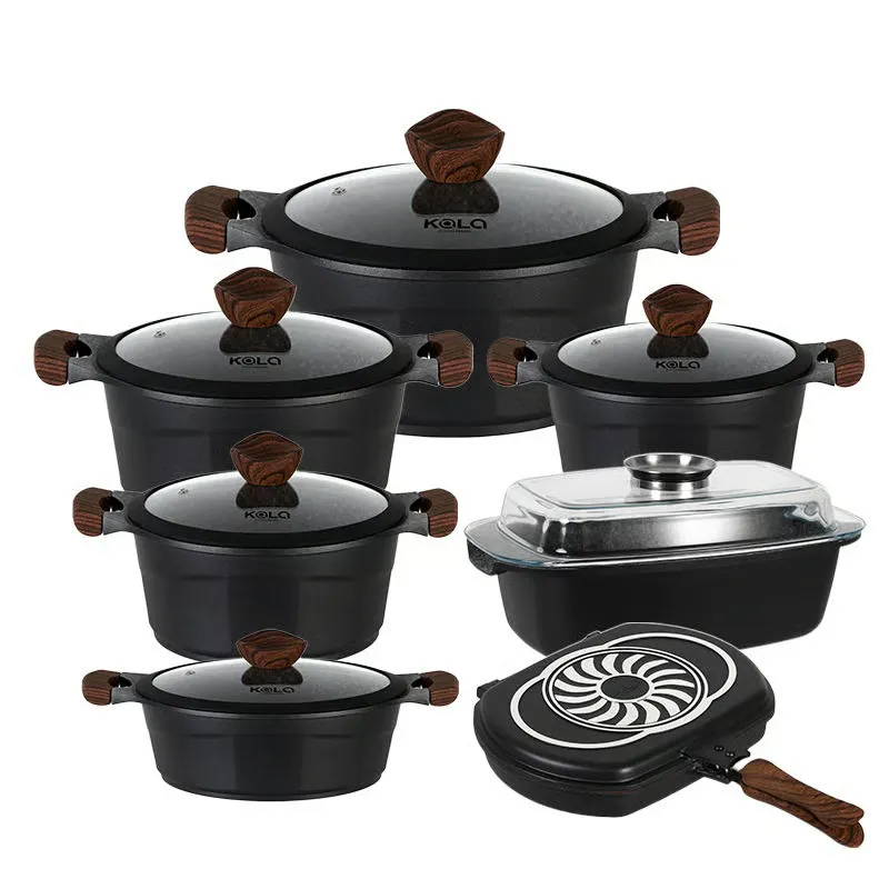 Juego de ollas KALA-017 de 14 piezas, con acabado de roca volcánica, tapas de vidrio templado y asas imitación madera. Incluye ollas, cacerolas, parrilla grill y fuente rectangular para horno, ideal para una cocina completa y elegante.